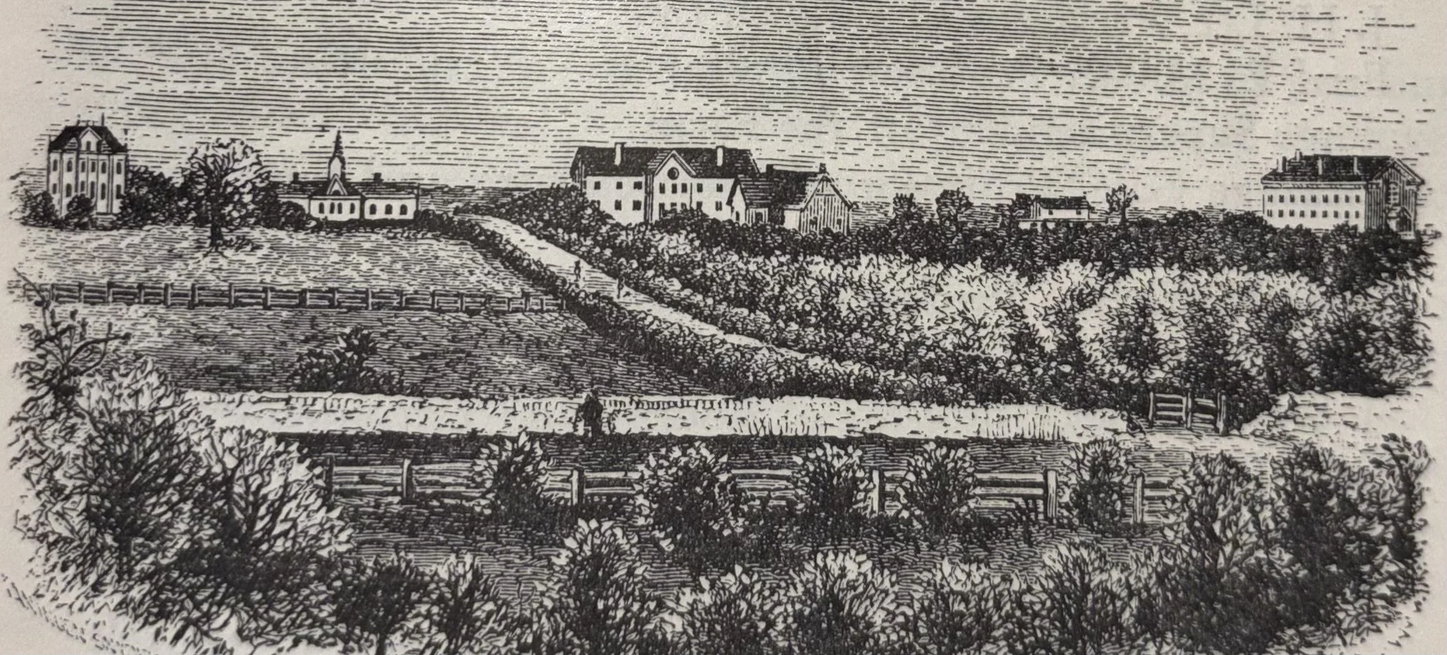 Illustrated photo of KSAC Campus from the First Biennial Report of the State Board of Agriculture, 1877-1878. Looking Northwest.